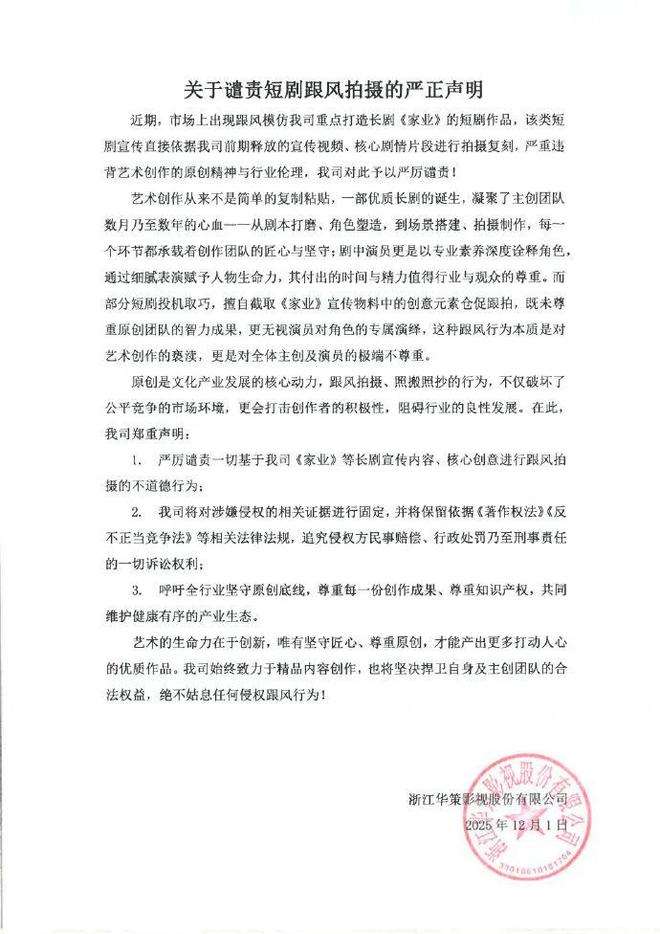 | 华策反应 | 发表声明称遭跟风模仿,将采取维权措施 |